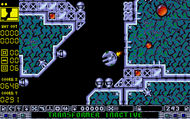 On the left-hand side, is a map detailing your position, the dots above that are your remaining lives. The coordinates of zeros will change once the mission is complete to show the exit location to rendezvous (the other coordinates are your current location). The three icons between these are 1) the time left until a bomb explodes. 2) The time left until a disabled laser resumes. 3) The required number of crystals to gain exit coordinates.At the bottom of the screen is the radar and this shows helpful information like the state of your armour, cargo, and remaining fuel. However, it also displays potential enhancements that can be gained by collecting pearls. For example, the second icon is for the ship's rotational speed. The third icon improves upon its lethargic thrust.